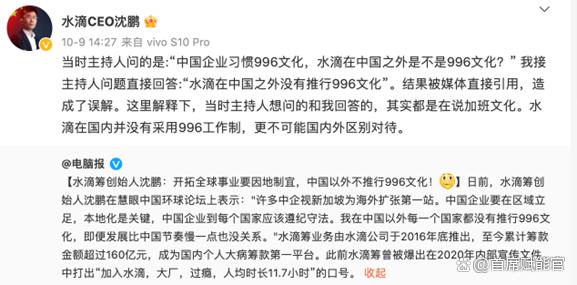 10月9日下午,沈鵬在微博上進(jìn)行回應(yīng),聲稱是媒體引用的時(shí)候,出現(xiàn)了誤解,水滴在國內(nèi)并沒有采用996工作制,更不可能國內(nèi)外區(qū)別對待。