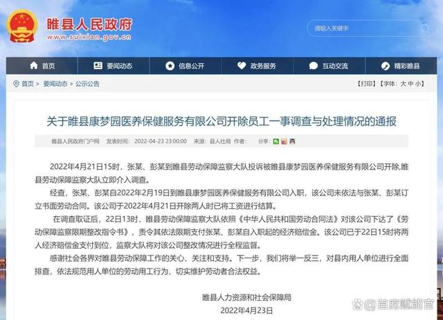 據(jù)媒體報(bào)道,4月22日,當(dāng)?shù)貏趧颖U媳O(jiān)察大隊(duì)依法對涉事的醫(yī)養(yǎng)中心下達(dá)了《勞動保障監(jiān)察限期整改指令書》,責(zé)令其依法限期支付張某、彭某自入職起的經(jīng)濟(jì)賠償金,并督促于當(dāng)日支付到位。