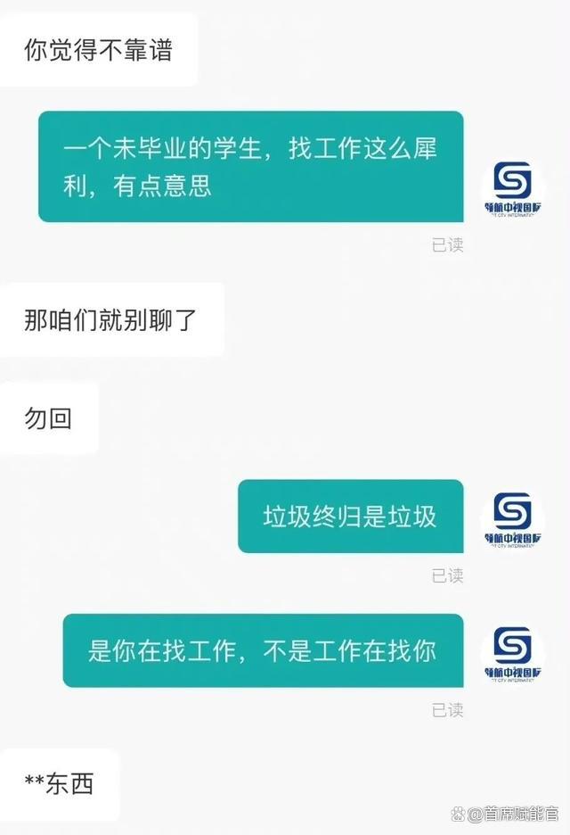 2022年4月11日,湖南一名大學(xué)生在社交媒體發(fā)文稱,通過BOSS直聘平臺與一家叫湖南領(lǐng)航中視國際公司HR溝通時(shí),該公司HR詢問當(dāng)事人有無實(shí)習(xí)經(jīng)歷,當(dāng)事人回復(fù)沒有,HR稱“學(xué)校不靠譜”,當(dāng)事人回復(fù)沒必要再聊,該HR竟回稱“垃圾終歸是垃圾”、“是你找工作,不是工作在找你”。該求職者覺得好好找工作卻被無端辱罵,無法忍耐,遂向平臺投訴。