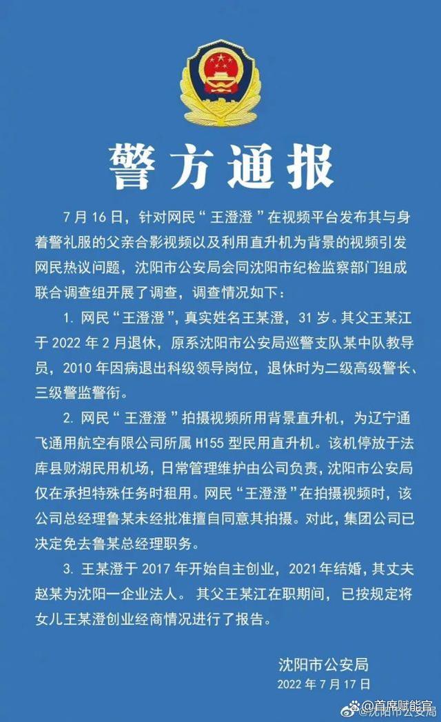 7月17日,沈陽警方回應(yīng)稱,王某澄所用背景直升機(jī)為民用直升機(jī),沈陽市公安局僅在承擔(dān)特殊任務(wù)時(shí)租用。父親原系沈陽市公安局巡警支隊(duì)某中隊(duì)教導(dǎo)員,已退休。