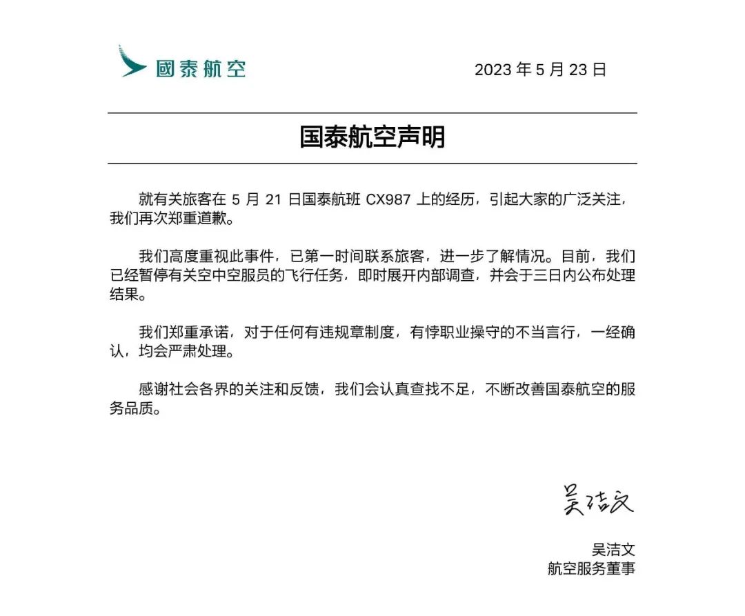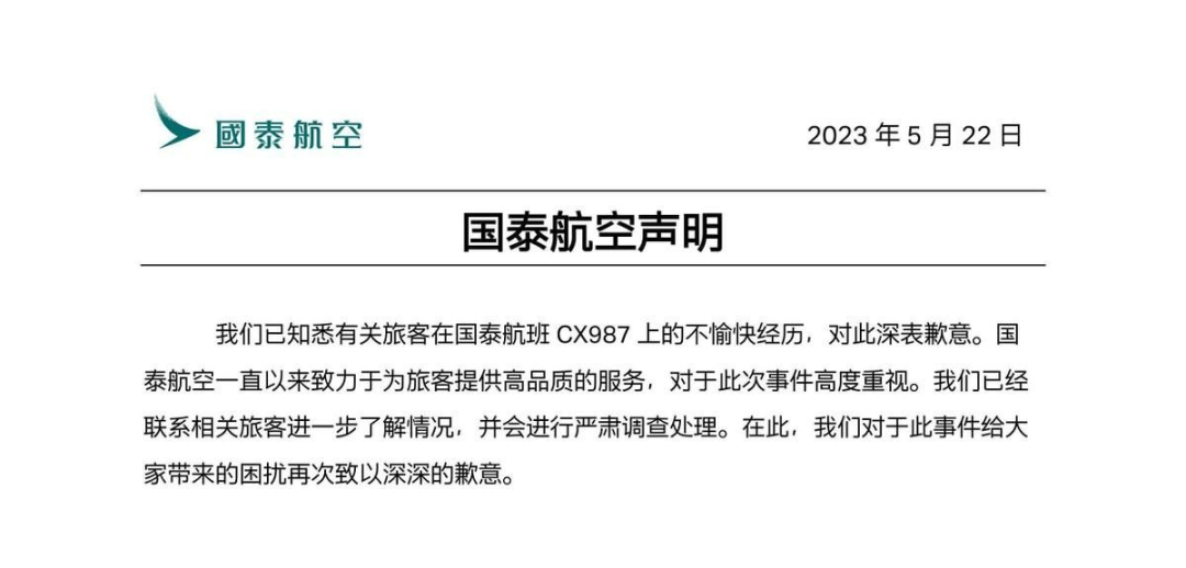 當(dāng)晚,國泰航空發(fā)布聲明,對乘客的“不愉快經(jīng)歷”表示歉意,稱已經(jīng)聯(lián)系相關(guān)旅客進(jìn)一步了解情況,并會進(jìn)行嚴(yán)肅調(diào)查處理。