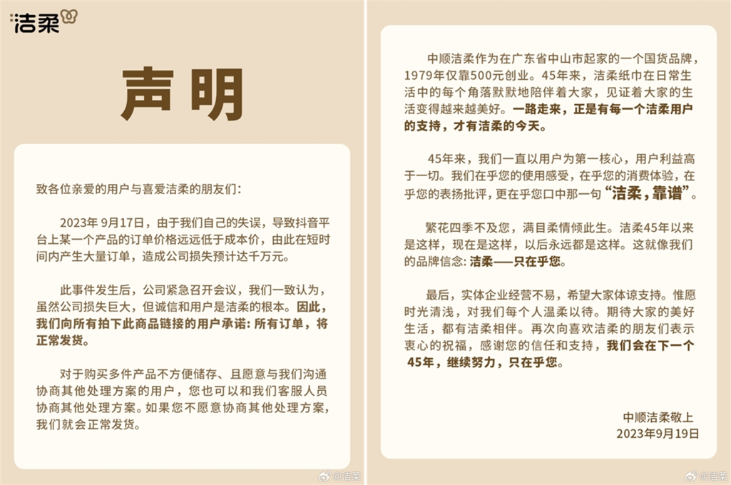 此前,曾有多個品牌出現(xiàn)因失誤而產(chǎn)生大量超低價訂單的案例,商家往往因無法履約選擇強制退款甚至注銷店鋪,從而導(dǎo)致口碑翻車。而2023年,多家品牌像361度一樣,采取直面問題、主動擔(dān)責(zé)、積極整改的做法。中順潔柔、活力28就是其中的兩家。