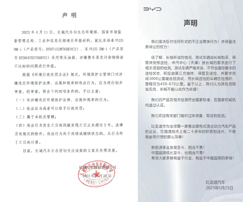 2023年5月25日,長城汽車公眾號發(fā)布聲明稱,長城汽車4月11日向生態(tài)環(huán)境部、國家市場監(jiān)管總局、工信部遞交舉報材料,舉報比亞迪個別車型采用常壓油箱,涉嫌污染物排放不達(dá)標(biāo)。