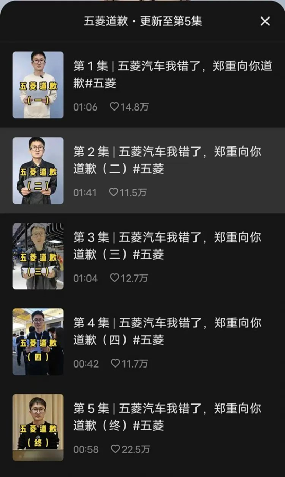 隨后王飛不僅在多個平臺連續(xù)道歉,而且還“貼心”地在其抖音賬號制作了一個名為“五菱道歉”的視頻合集,以方便網(wǎng)友查看。