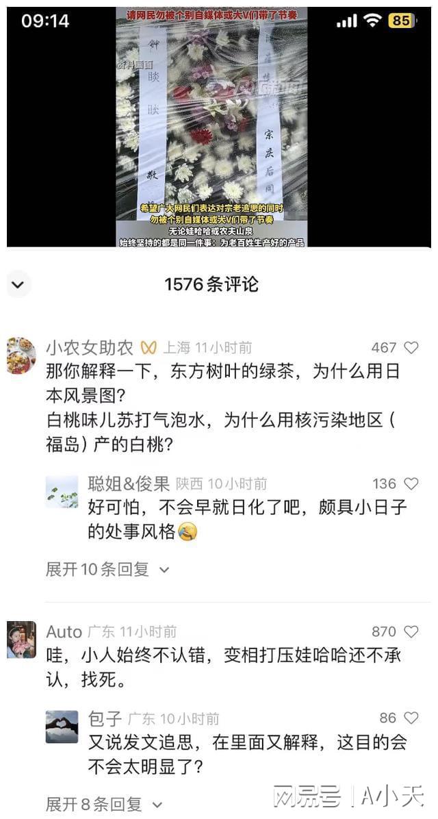 在悼念過程中,大家發(fā)現(xiàn),農(nóng)夫山泉創(chuàng)始人鐘睒睒和宗慶后之間,有包括商戰(zhàn)在內(nèi)一些過往,并逐步演變成對鐘睒睒和農(nóng)夫山泉的diss。