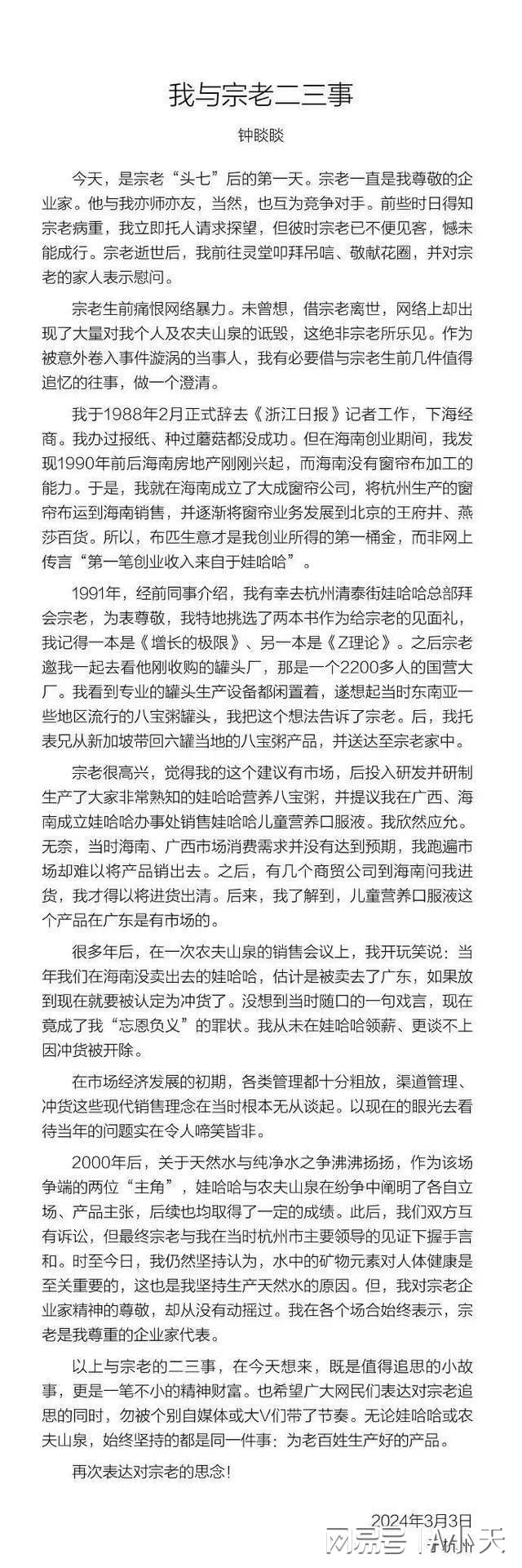 針對此次輿情事件,3月3日鐘睒睒在上述發(fā)文中澄清了以下幾點(diǎn):首先是宗老逝世后,他曾去靈堂叩拜吊唁;另外他也澄清其第一筆創(chuàng)業(yè)收入并非來自于娃哈哈;也從未在娃哈哈領(lǐng)薪,所以也談不上當(dāng)年因?yàn)闆_貨被開除;而當(dāng)年娃哈哈與農(nóng)夫山泉作為主角的“純凈水與天然水之戰(zhàn)”,雖然雙方互有訴訟,但兩人最終也在杭州市主要領(lǐng)導(dǎo)的見證下握手言和。最后他在文末表示,“希望廣大網(wǎng)友們表達(dá)對宗老追思的同時(shí),勿被個(gè)別自媒體或大V帶了節(jié)奏,無論娃哈哈或農(nóng)夫山泉,始終都堅(jiān)持為老百姓生產(chǎn)好的產(chǎn)品?!?/p>